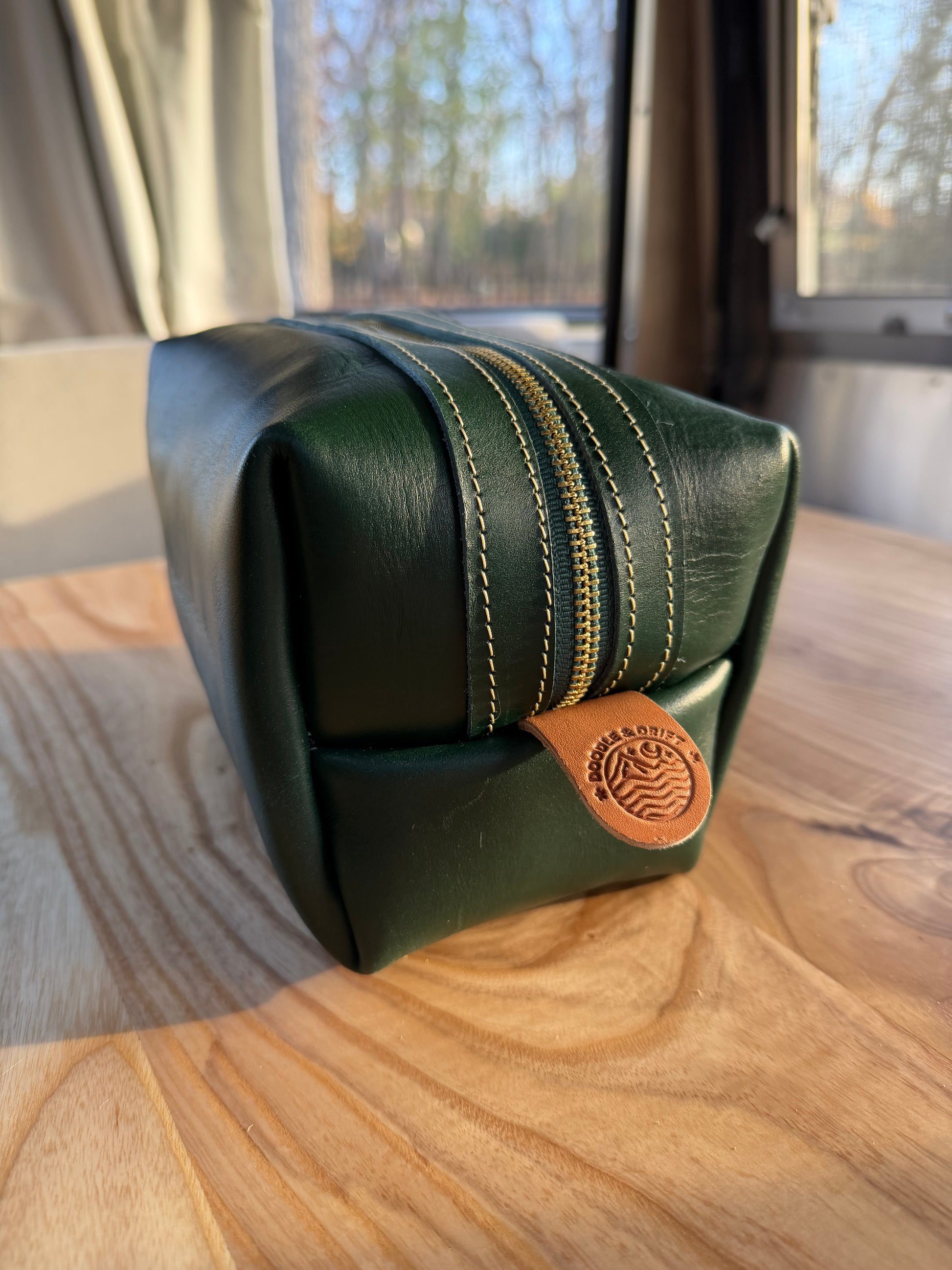 Full-grain leather naturally develops character as it’s used. Small variations, marks, and patina are part of its story. Occasional conditioning will keep your Dopp kit looking its best season after season.