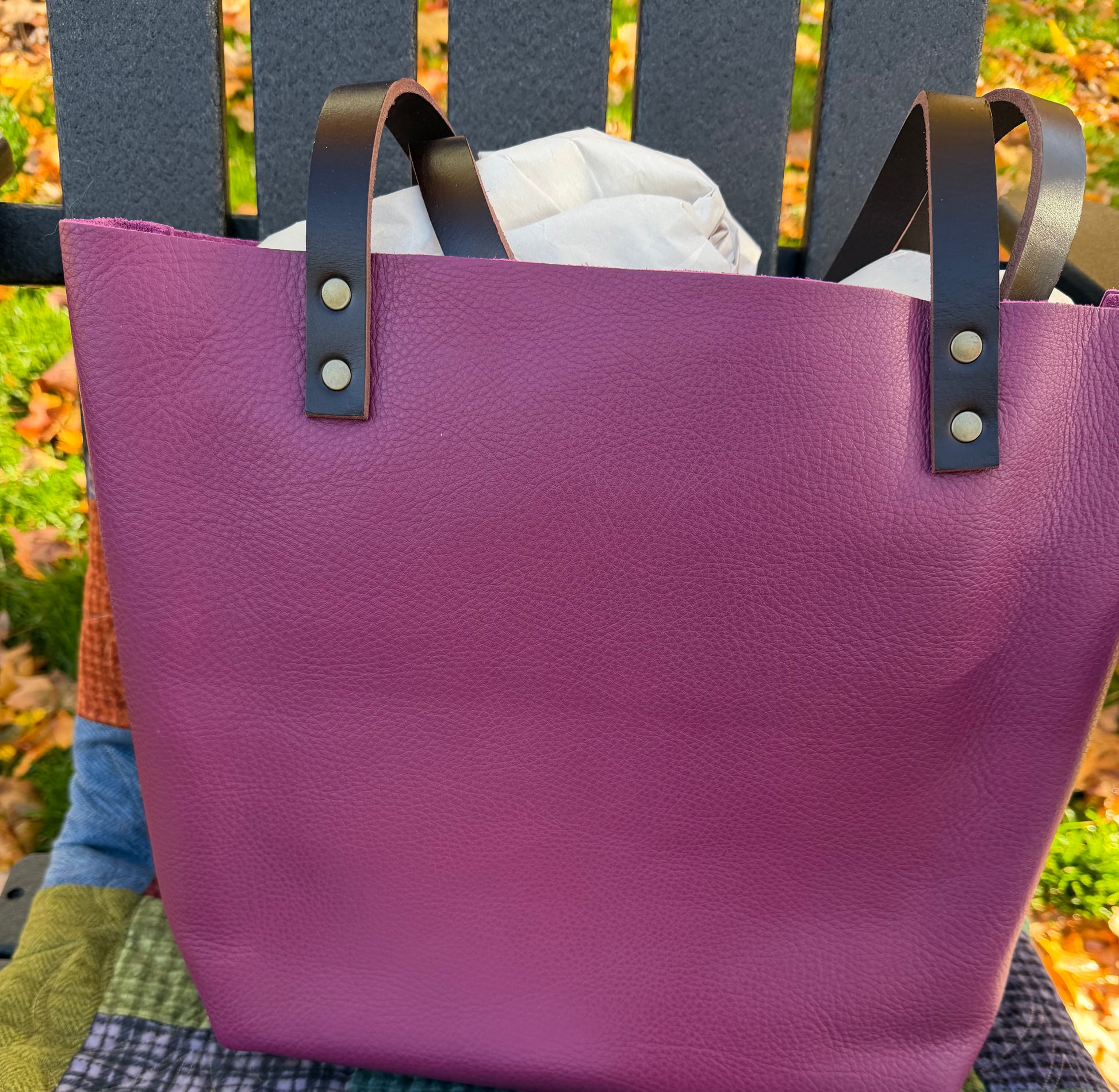 A true standout from Portland Leather Goods, this Large Classic Tote in Iris is a magenta daydream — rich, vibrant, and joyfully bold. Crafted from full-grain pebbled leather with dark grizzly straps, this limited-edition color is no longer available from PLG, making it a rare find.