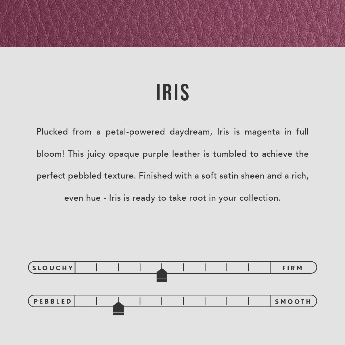 The Iris leather features a juicy purple hue with a soft satin sheen and subtle texture that feels both refined and playful. This tote is in excellent used condition, showing little to no signs of wear — its pebbles are lovely and even throughout.